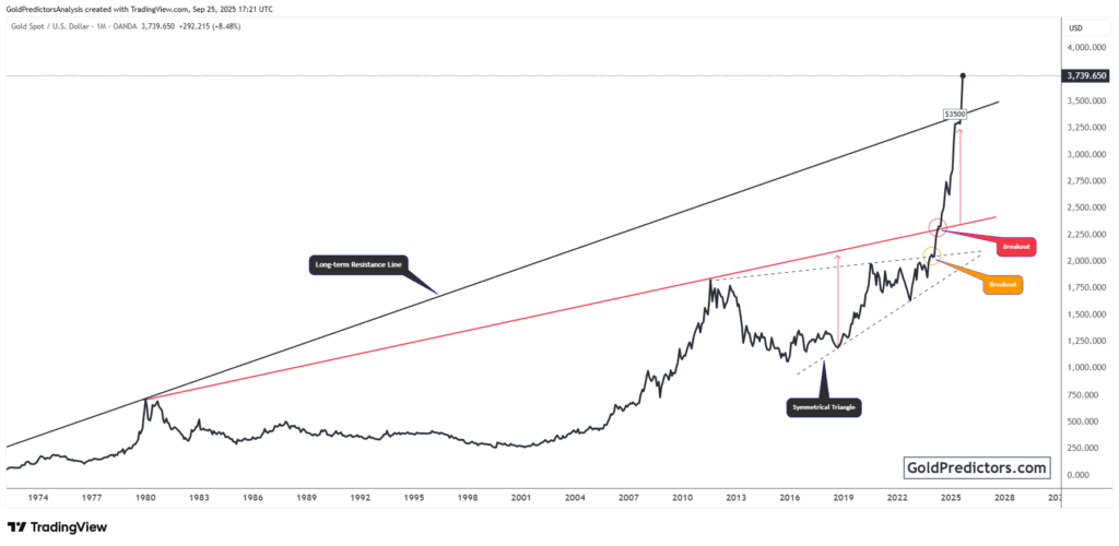 Gold breaks decade-long triangle, surging past 1980 resistance. Momentum and miner outperformance confirm a phase in gold’s bull market.