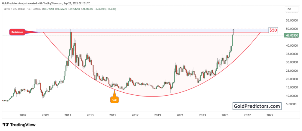 Silver nears $50 with decade-long cup formation and rising S&P 500 ratio, signaling major breakout potential.