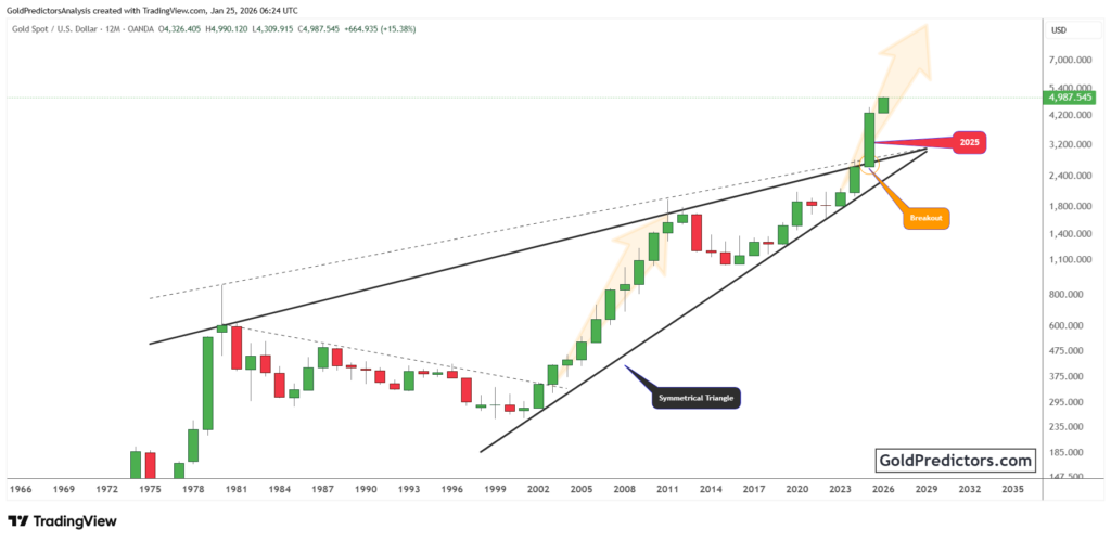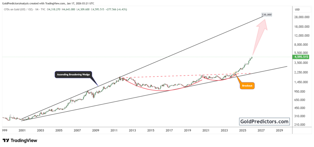 Gold breaks multi-decade resistance within a broadening wedge as rising ratio confirms a shift toward long-term upside.