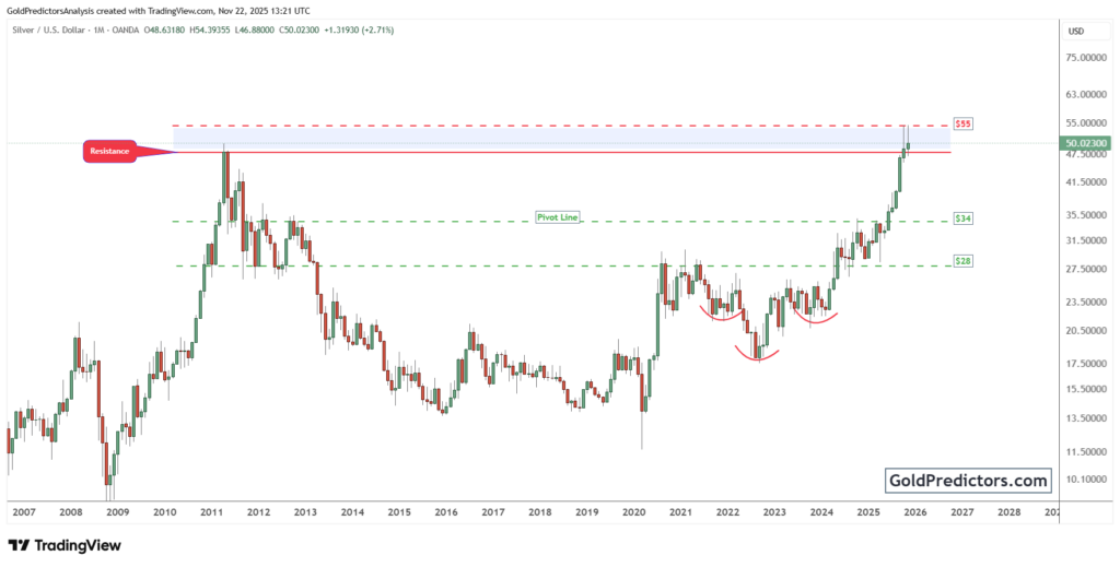 Silver tests multi-decade resistance near $55 after breaking above key pivot levels and gaining strength against equities.